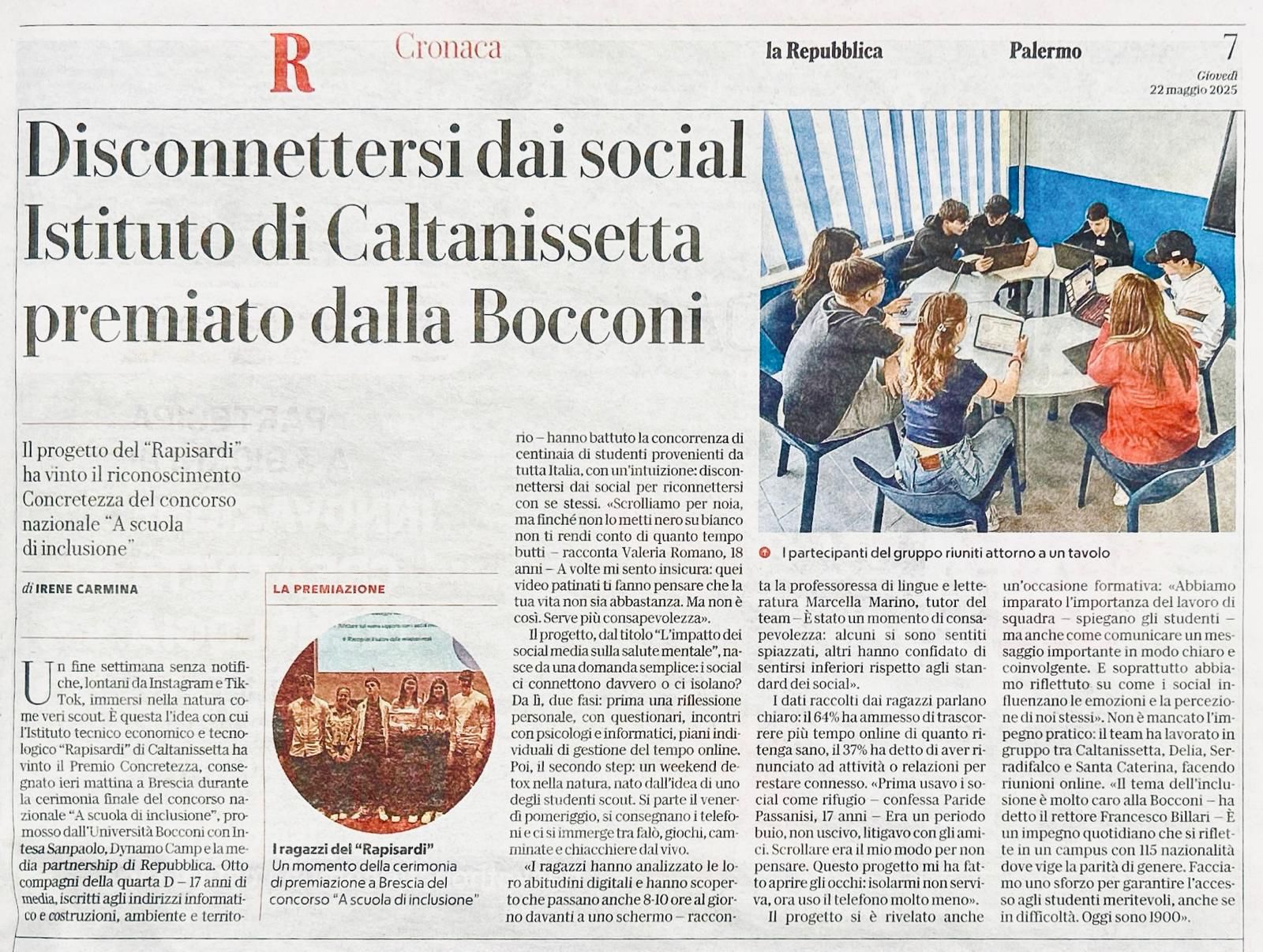 “Un fine settimana detox con gli scout” , senza l’utilizzo di strumenti elettronici, è la proposta di un gruppo di alunni della 4aD ART dell’ITET Rapisardi da Vinci diretto dalla Dott.ssa Santa Iacuzzo e coordinati dalla Prof.ssa Marcella Marino, che ha permesso loro di vincere un premio in seno al concorso nazionale “A scuola d’inclusione” promosso dall’Università Bocconi di Milano.