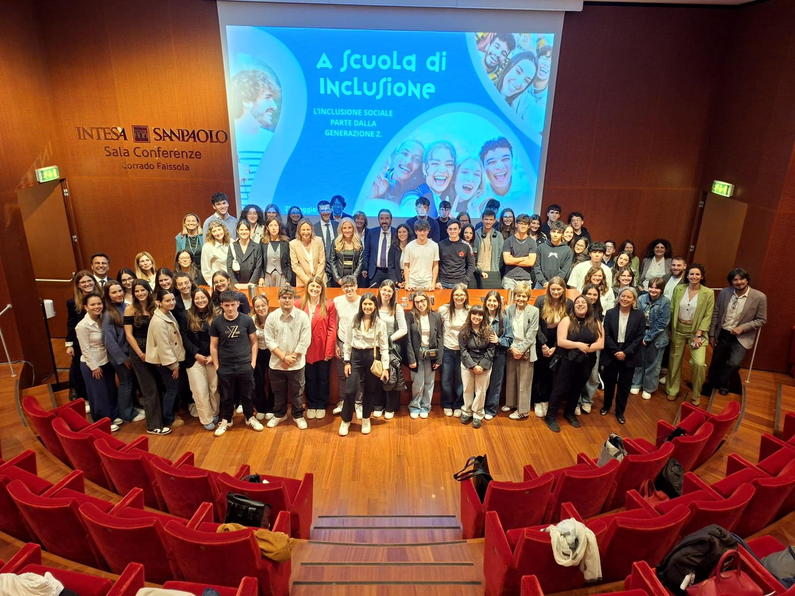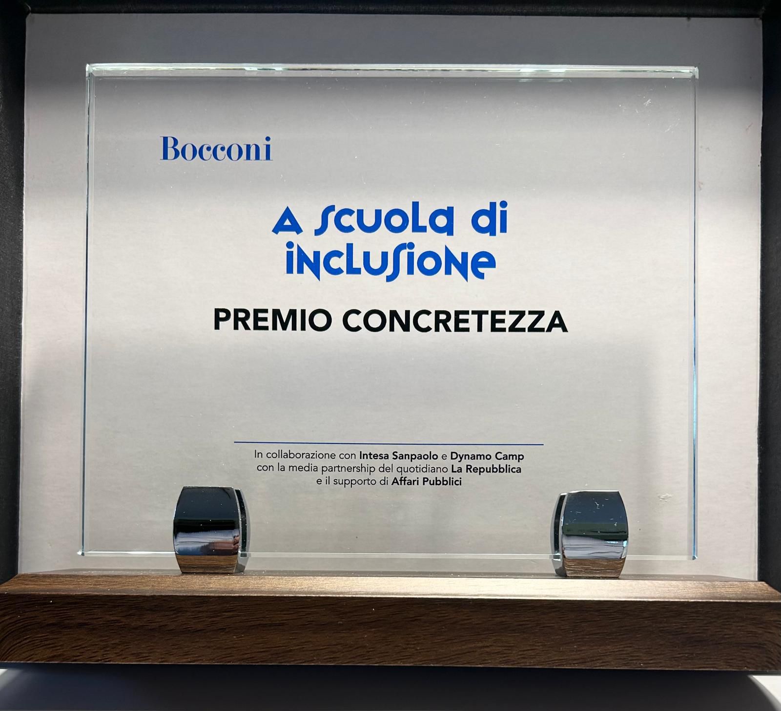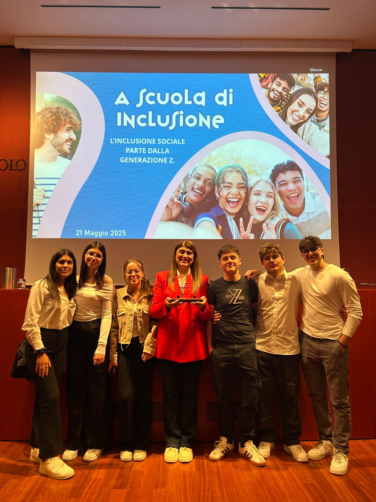 Giorno 21 maggio infatti gli alunni Carlo Bennardo, Miriana Fallea, Samuele Leone, Loris Mantione, Chiara Narbone, Valeria Romano e Simone Tambè – componenti del team “Quattro voci, un obiettivo” – hanno ricevuto a Brescia, presso la sede di Intesa Sanpaolo, – partner del progetto insieme a Dynamo Camp, Affari pubblici e Repubblica – il “Premio alla Concretezza”.